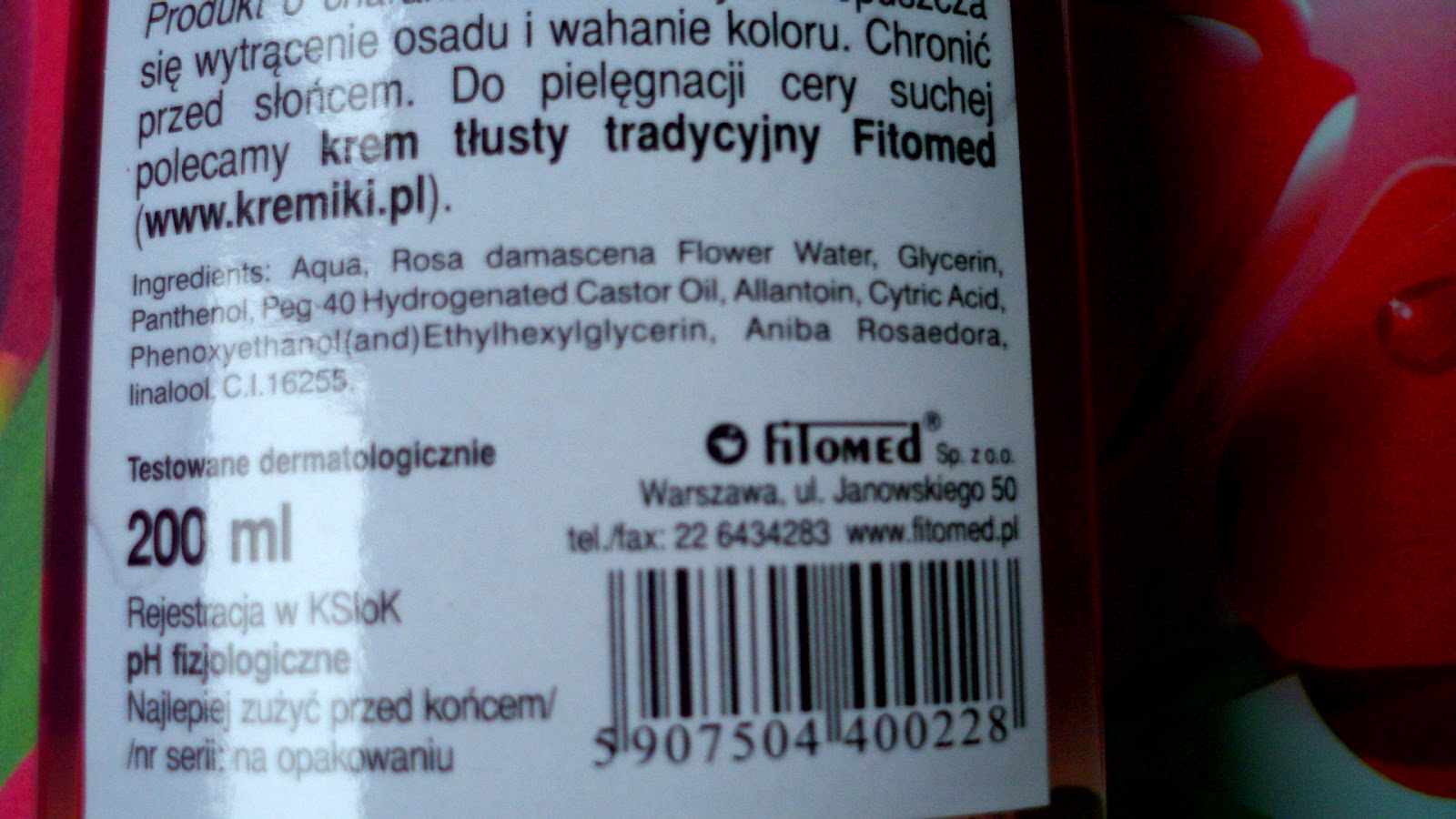 Skład: Aqua, Rosa damascena Flower Water, Glycerin, Panthenol, Peg-40 Hydrogenated Castor Oil, Allantoin, Cytric Acid, Phenoxyethanol(and)Ethylhexylglycerin, Aniba Rosaedora, linalool, C.I.16255.