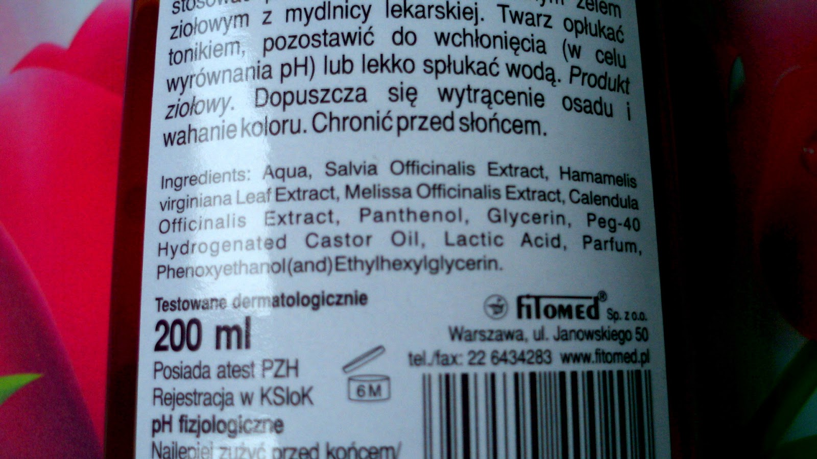 Skład: Aqua, Salvia Officinalis Extract, Hamamelis virginiana Leaf Extract, Melissa Officinalis Extract, Calendula Officinalis Extract, Panthenol, Glycerin, Peg-40 Hydrogenated Castor Oil, Lactic Acid, Parfum, Phenoxyethanol(and)Ethylhexylglycerin.